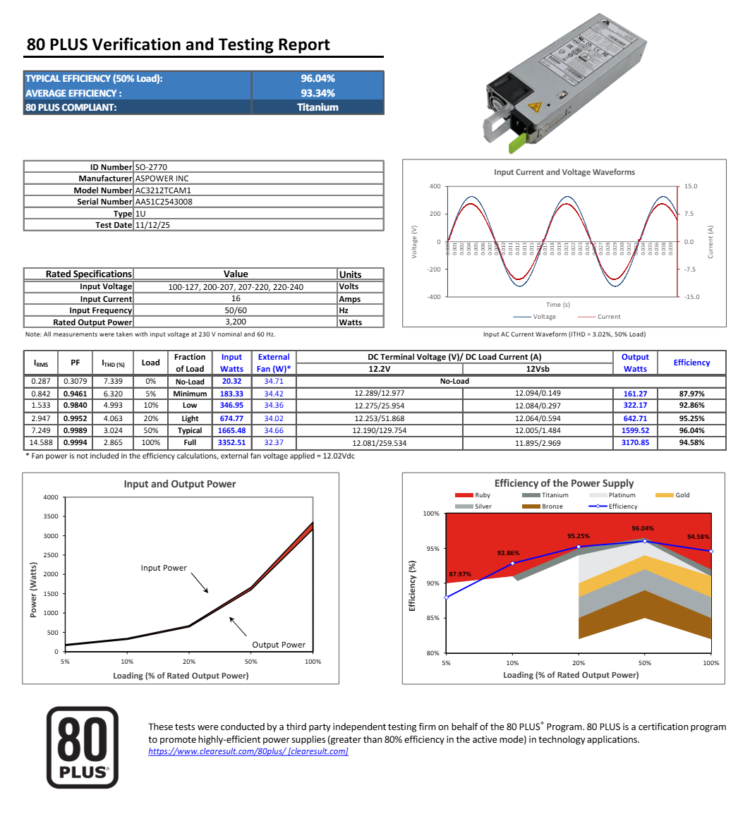 ASPOWER歐陸通 AC3212TCAM1采用1U緊湊機身設(shè)計,額定輸出功率達3200W,輸入規(guī)格支持100–127V及200–240Vac全球?qū)掚妷狠斎?,額定輸入電流16A。能效表現(xiàn)尤為亮眼,在230V工況下,5%/10%/20%/50%/100%負載點效率分別達87.97%/92.86%/95.25%/96.04%/94.58%,平均效率約93.34%,空載輸入功耗僅20.32W,成功斬獲80PLUS鈦金認(rèn)證。電源DC側(cè)以12V母線為主并配備12Vsb待機輸出,供電穩(wěn)定性拉滿。